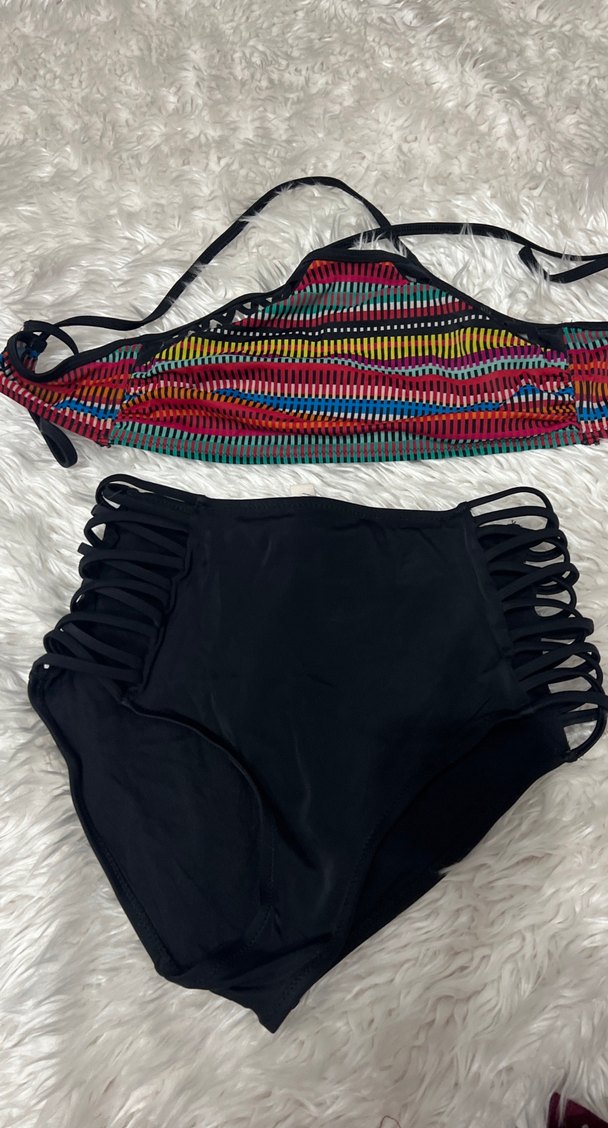 Bohem tarzda, çok renkli bağcıklı üst ve yanları elastik siyah mini alt bikini takımı. Plaj için uygun. ️