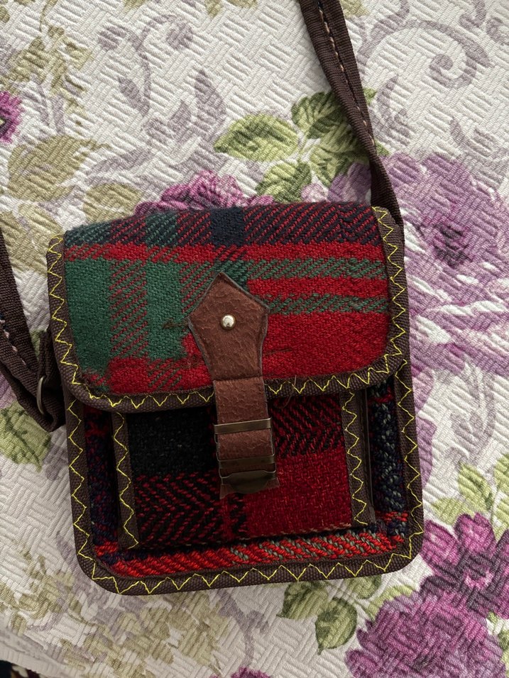 Bohem tarzda, çok renkli tekstil malzemeden yapılmış, tokalı kapaklı çapraz çanta. Canlı renkleri ve desenleri günlük kullanım için uygundur. Hiçbir kusuru yoktur