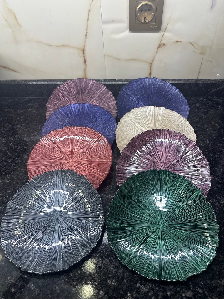 Bohem tarzda, çok renkli ve koyu tonlarda tie-dye desenli tabak seti. Her tabak benzersiz dokulu desene sahiptir. ️