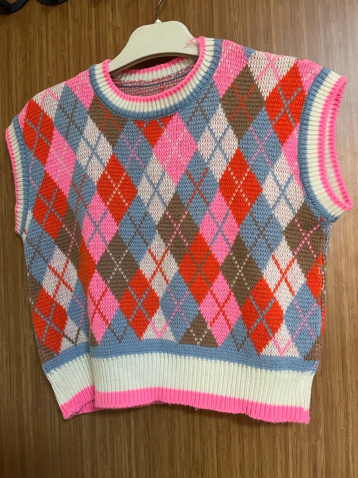 Yuvarlak yaka, kolsuz ve bol kesim olan bu triko süveter, çok renkli pastel argyle deseniyle bohem bir tarz sunar. Rahat ve günlük kullanıma uygun.