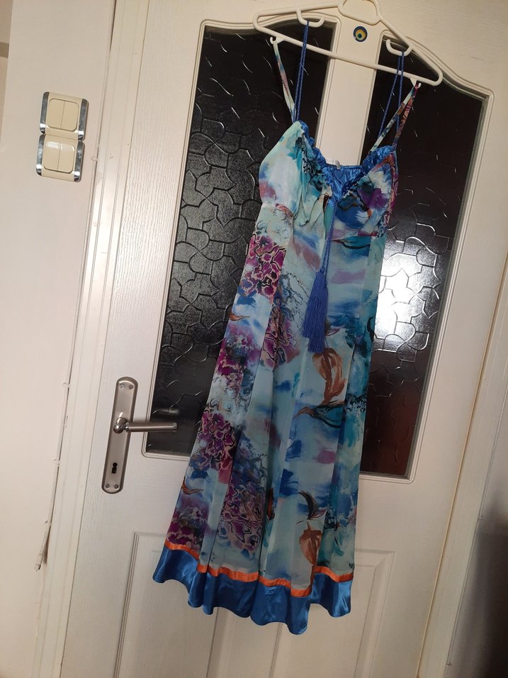 Fransız malı exaltation paris marka,bohem tarzı,astarlı,ayarlanabilen çift askılı ve kolsuz uzun elbise. Gevşek kesim,volanlı ve drapeli detaylara sahip,gece mavisi pastel tonlarda,batik desenli,yumuşak ipek/krep/saten ve sadece gece belli olan simli kumaştan,benzersiz şık elbise