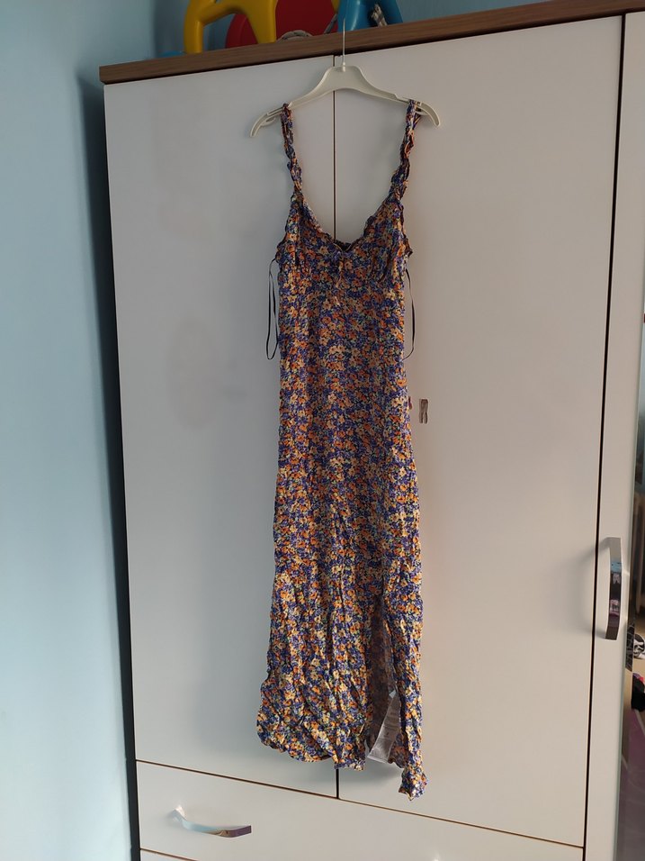 Bohem tarzı, çok renkli uzun elbise. Askılı, gevşek kesim ve drapeli tasarıma sahip, yumuşak sentetik kumaştan üretilmiştir.