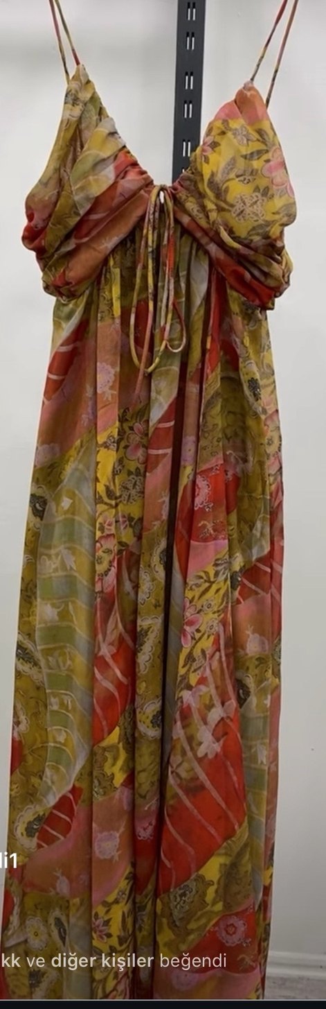 Kadınlar için çok renkli, askılı, straplez yaka uzun elbise. İpek gibi yumuşak kumaştan, bol kesim ve drapeli bohem tarzda.