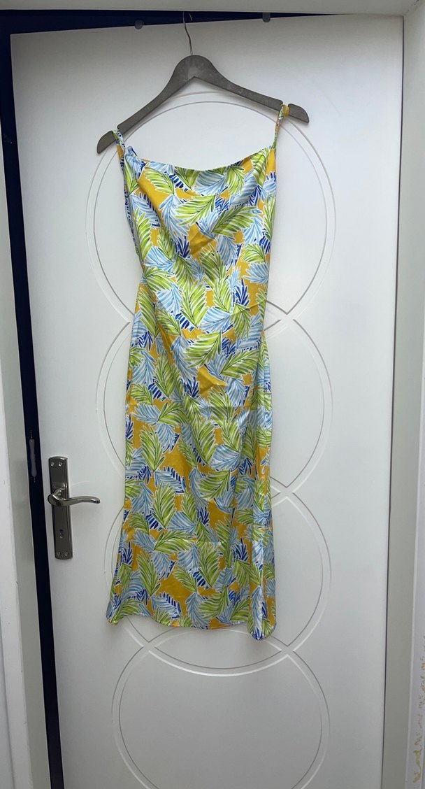 Bohem tarzda, askılı ve drapeli yakaya sahip, vücuda oturan uzun elbise. Yumuşak sentetik kumaştan, açık renkli yaprak desenli, günlük kullanım için uygun.