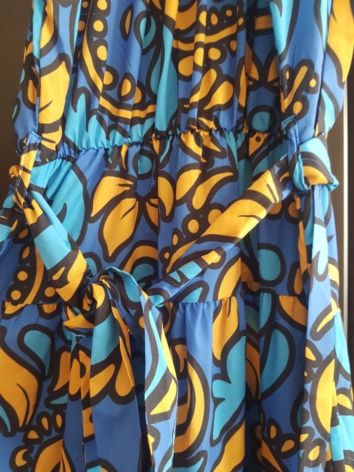 Bohem tarzda, çok renkli desenli, volan detaylı ve V yakalı uzun elbise. Rahat kesim ve askılı kollu, yumuşak sentetik kumaştan günlük kullanım için uygundur.