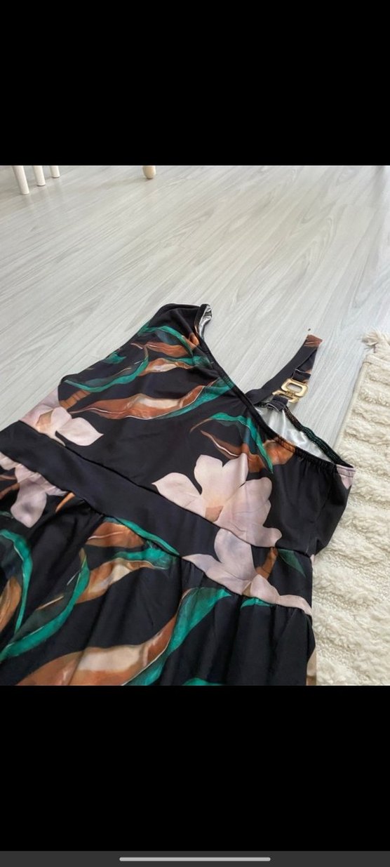 Bohem tarzda, askısız görünümlü ve ayarlanabilir askılı, bol kesim uzun elbise. Koyu tonlarda batik desenli, dökümlü tasarıma sahip sentetik kumaştan yapılmıştır.