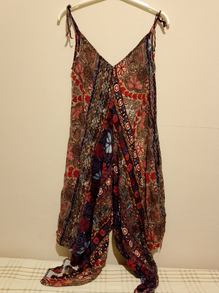 Bohem tarzda, askısız ve kolsuz, dökümlü tasarımlı elbise. Çok renkli desenli, uzun ve bol kesim kumaştan yapılmıştır. Günlük kullanım için uygundur.