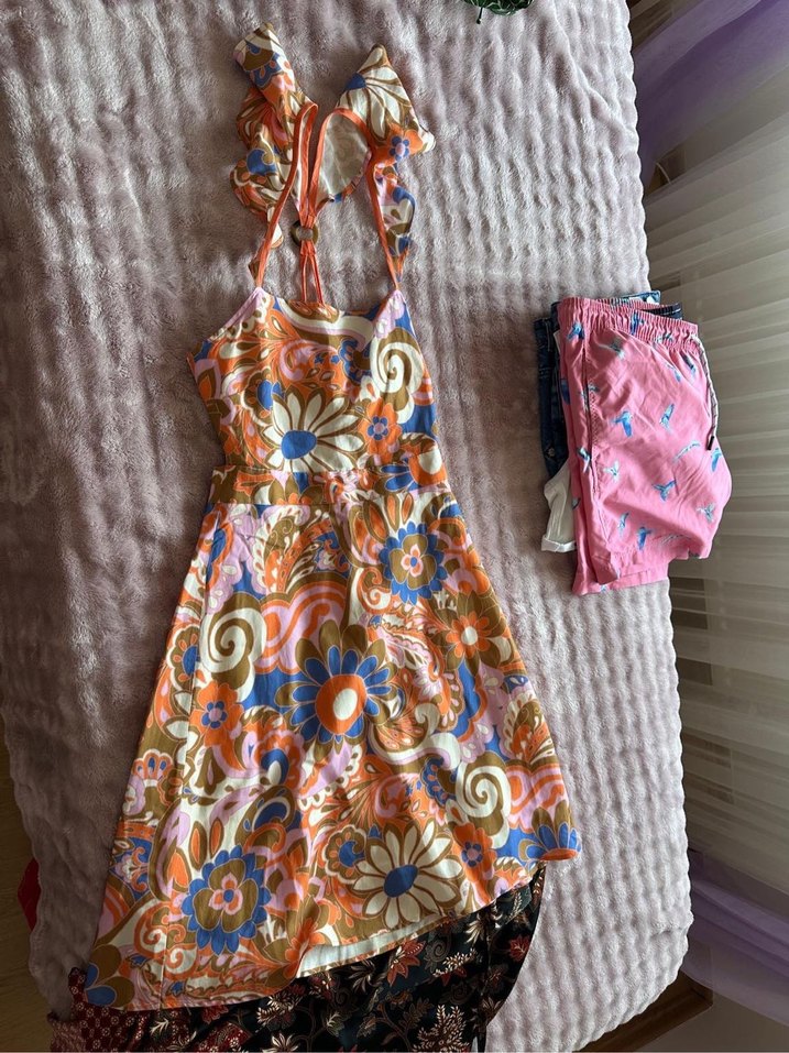 Gevşek kesim, askısız bohem elbise, pastel tonlarda batik desenli ve dantel detaylı, günlük kullanım için uygun.