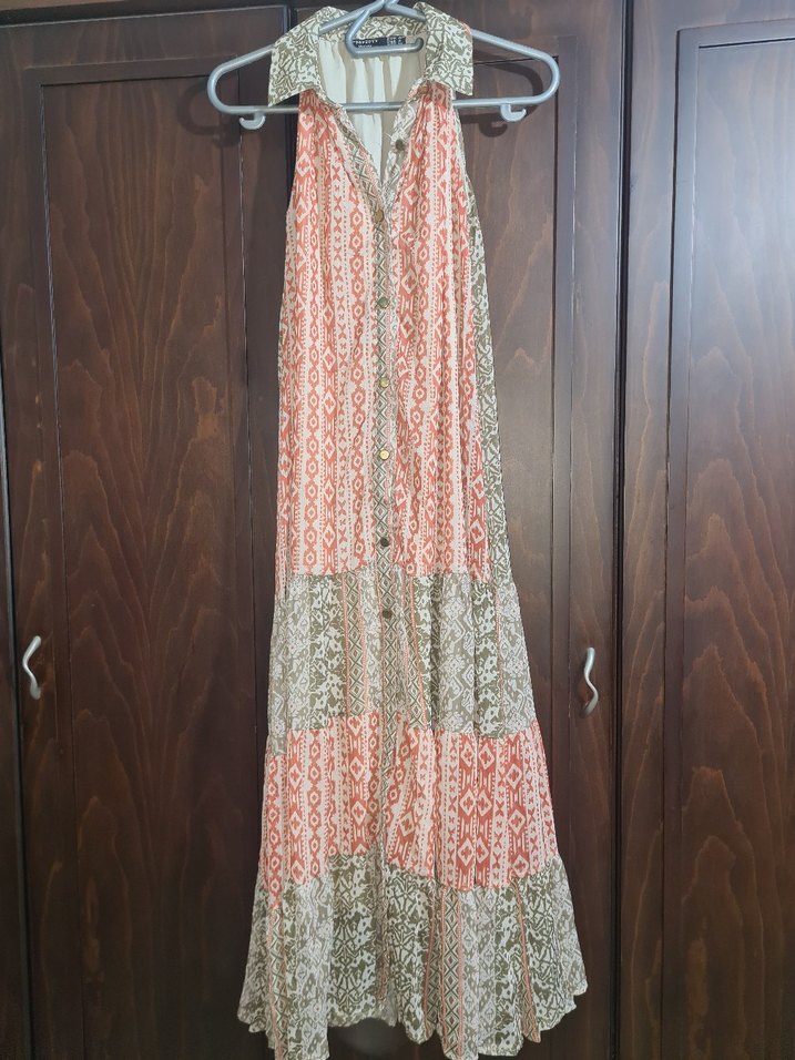 Bohem tarzda, askısız, bol kesim uzun elbise. Yumuşak kumaştan, pastel tonlarda batik desenli ve drapeli, günlük kullanıma uygun.