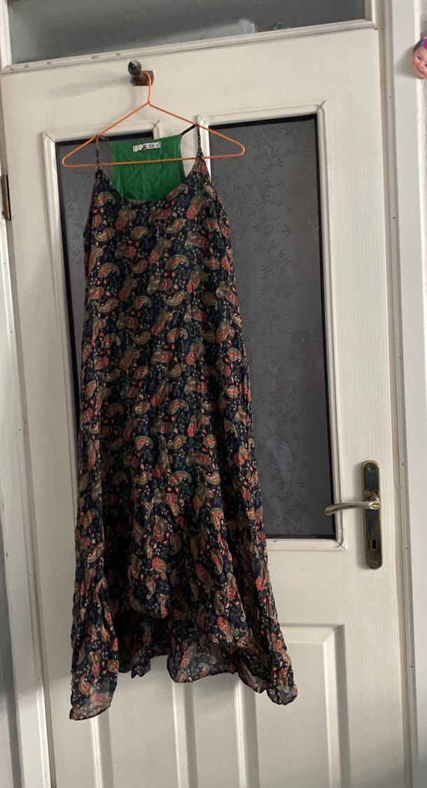 Bohem tarzı, çok renkli desenli, askısız ve bol kesim uzun elbise. Yumuşak sentetik kumaştan, günlük kullanıma uygun.