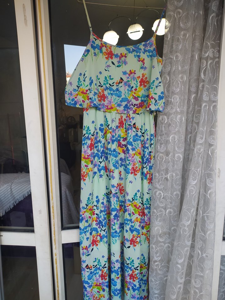 Bohem tarzda, askısız ve bol kesim, çok renkli çiçek desenli uzun elbise. Yumuşak sentetik kumaştan, dökümlü ve kolsuz, açık hava etkinlikleri için uygun.