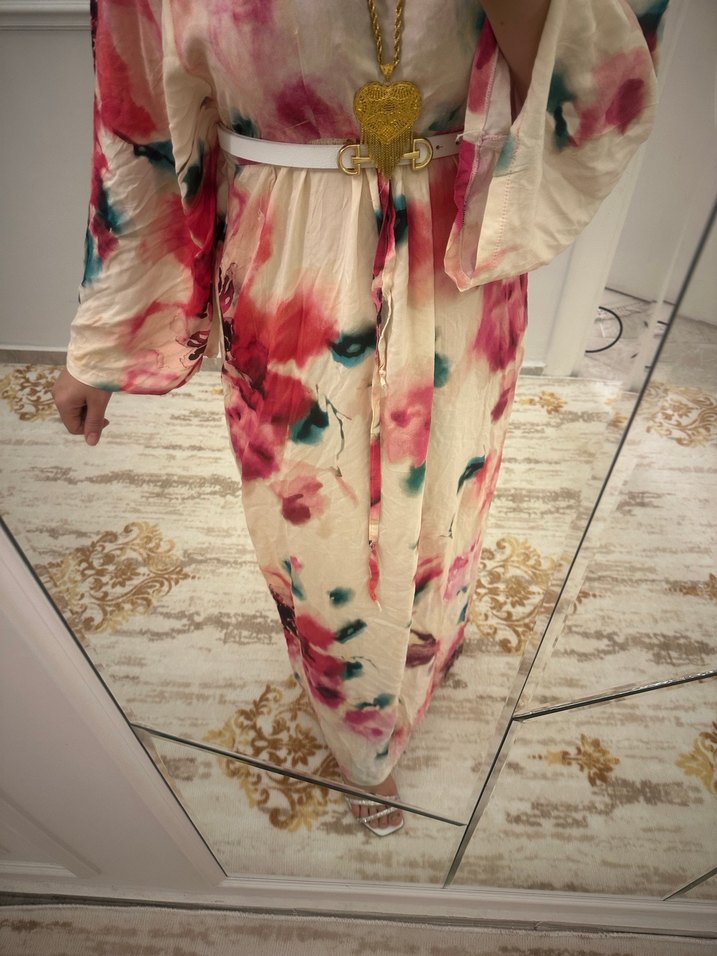 Bohem tarzda, çok renkli bağlamalı uzun elbise. Sentetik yumuşak kumaştan, straplez ve bol kesimdir, günlük kullanım için uygundur.