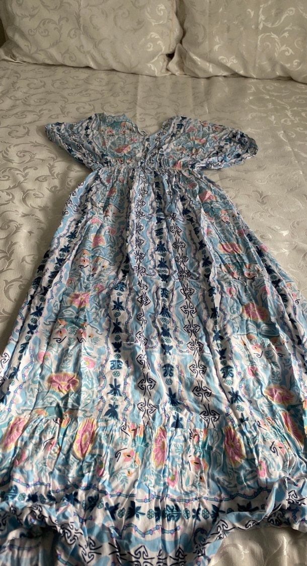 Bohem tarzı, bol kesim, drapeli, V yaka, kısa kollu uzun elbise. Pastel tonlarda bağlamalı desenli, günlük kullanıma uygun.