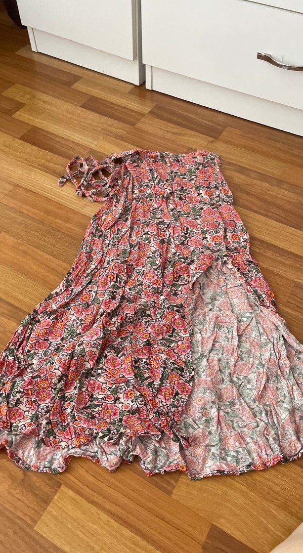 Bohem tarzda, çok renkli pastel tonlarda bağlamalı, bol kesim uzun hamile eteği. Günlük kullanıma uygun, dokuma kumaştan yapılmıştır.