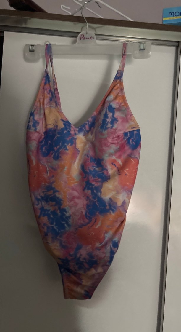 Hiç giyilmedi.Bu kadın mayo, pastel tonlarda çok renkli bağlamalı desene ve drapeli detaylara sahiptir. Kolsuz ve uzun kesimdir, plajda bohem tarz için uygundur.