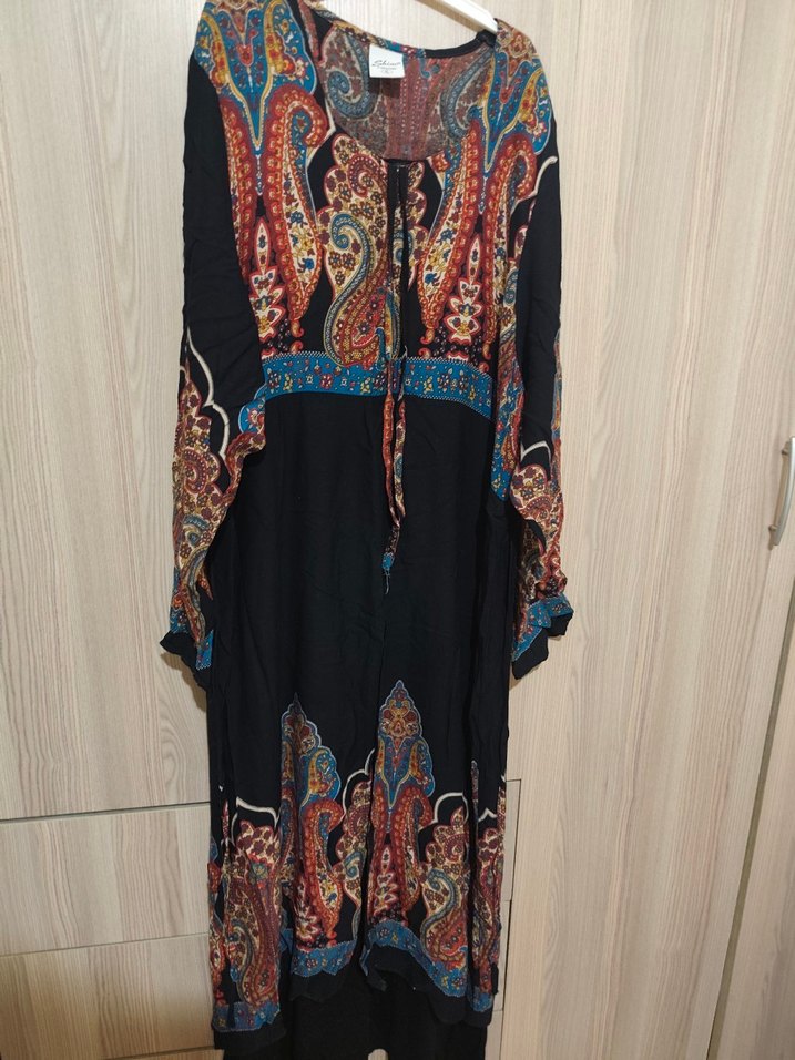 Uzun kollu, bol kesim ve V yakalı bu elbise, çok renkli desenleri ve dökümlü detayları ile yumuşak sentetik kumaştan üretilmiştir.