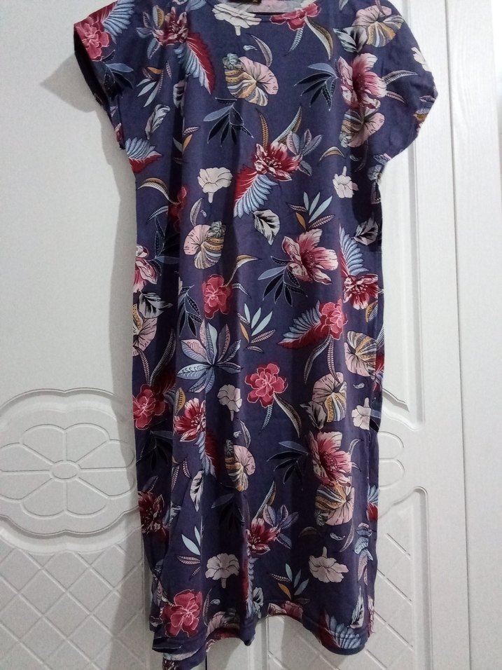 Bohem tarzda, kısa kollu, V yaka ve bol kesimli, dökümlü çok renkli çiçek desenli uzun elbise. Sentetik kumaştan, günlük kullanım için uygundur.