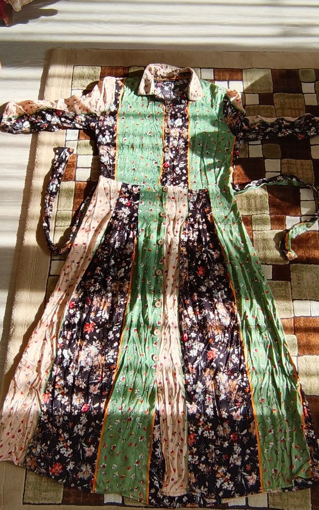 Bohem tarzda, çok renkli ve desenli uzun kadın elbisesi. Yakalı, askılı kollu, bol kesim ve drapeli kumaştan yapılmıştır. Günlük kullanıma uygundur.
