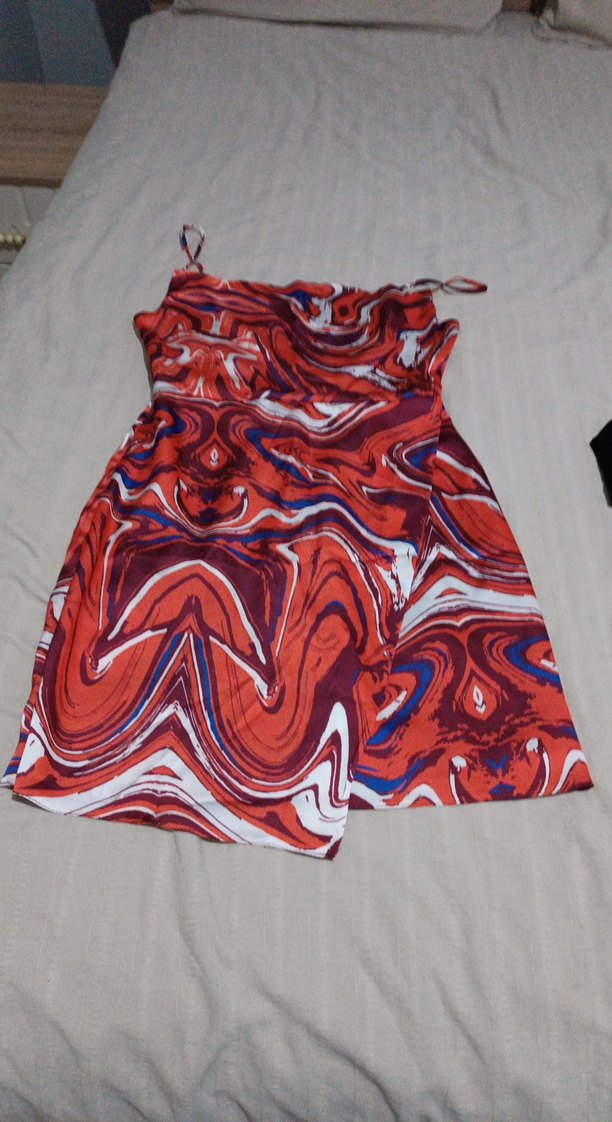 Drapeli tasarıma sahip, çok renkli koyu tie-dye desenli, yumuşak sentetik kumaştan üretilmiş uzun ve dar kesim elbise