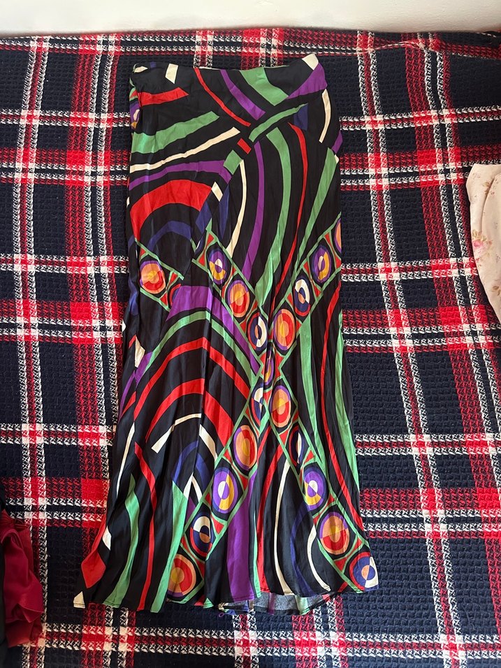 Bohem tarzda, çok renkli desenli, drapeli ve vücuda oturan uzun etek, günlük kullanım için uygundur.