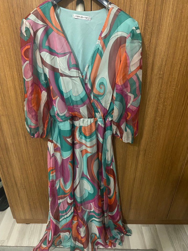 Bohem tarzda, çok renkli pastel tonlarda, dökümlü, V yaka ve askılı kollu uzun şifon elbise, parti için uygun.