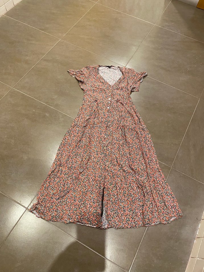 Kadınlar için bohem tarzda, kısa kollu, V yakalı, düğmeli, bol kesim, uzun elbise. Pastel çok renkli batik desenli, yumuşak sentetik kumaştan, günlük kullanım için uygundur.