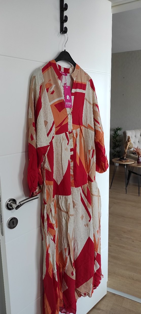 Bohem tarzda, bol kesim ve drapeli çok renkli uzun elbise. Uzun kollu, sentetik kumaştan, canlı batik desenli ve V yakalı, günlük kullanıma uygun.