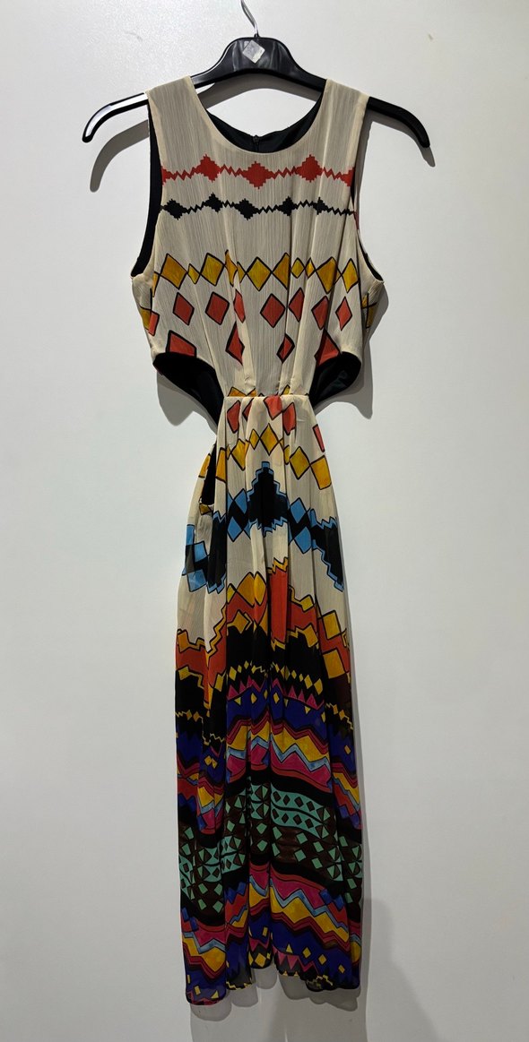 Kolsuz, vücuda oturan uzun elbise, çok renkli desen ve drapeli V yakaya sahip, parti için uygun.