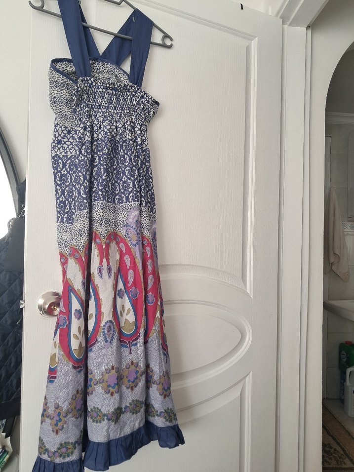 Kolsuz, straplez yaka ve bol kesime sahip bohem elbise. Tekstil kumaştan, çok renkli tie-dye desenli ve gri ağırlıklı. Günlük kullanıma uygun.