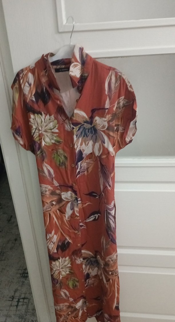 Bohem tarzda, V yakalı, kısa kollu, dökümlü ve bol kesim çok renkli uzun elbise. Sentetik kumaştan, koyu tonlu çiçek desenli.