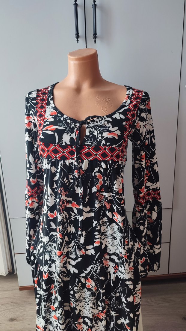 Bohem tarzı çok renkli uzun kollu kol ucu hafif balon. siyah üzerine beyaz ve turuncu desenli. koltuk altından koltuk altına 45cm. boy 105 cm gibi. mükemmel durumda