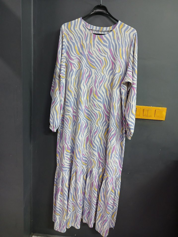 Bohem tarzda, bol kesim, piliseli uzun elbise. Tekne yaka ve uzun kolludur, yumuşak sentetik kumaştan pastel renkli batik desenlidir.