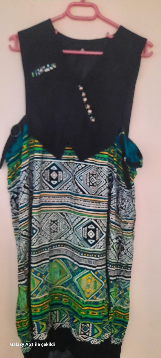 Kolsuz, V yaka, bohem tarzda, çok renkli koyu tonlarda batik ve geometrik desenli bol kesim uzun elbise. hamile elbisesi