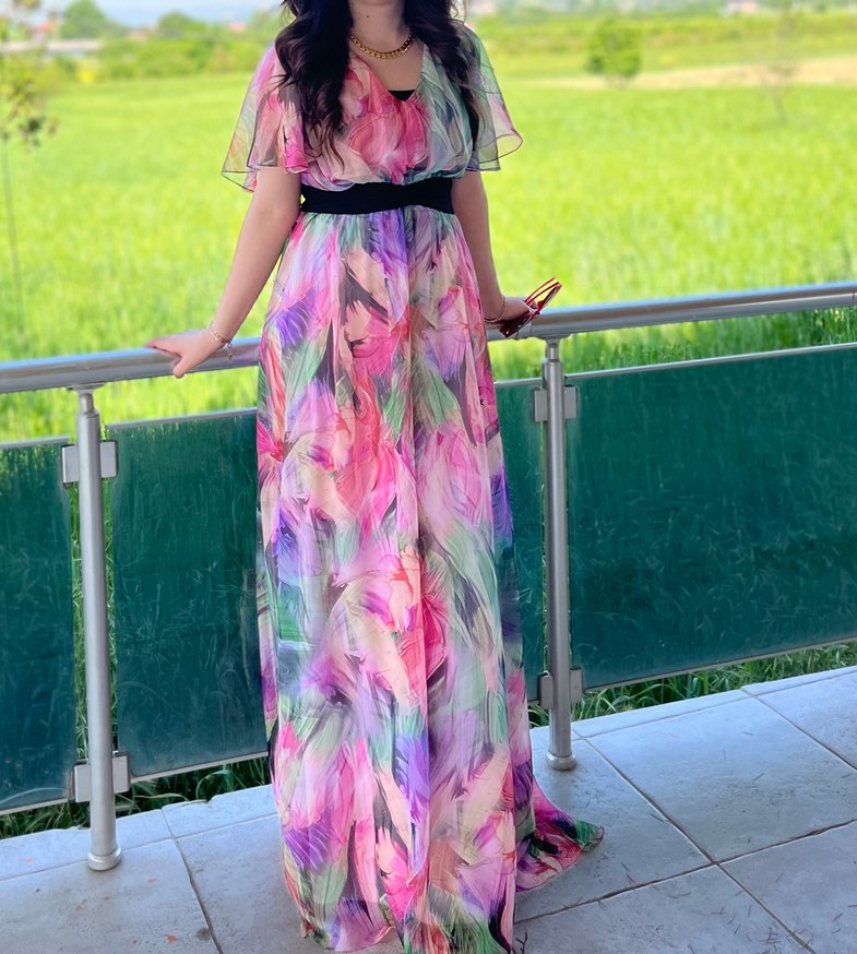 Bohem tarzda, askısız ve bol kesim uzun elbise. Yumuşak sentetik kumaştan, pastel tonlarda batik desenli ve drapeli, düğünler için uygun.