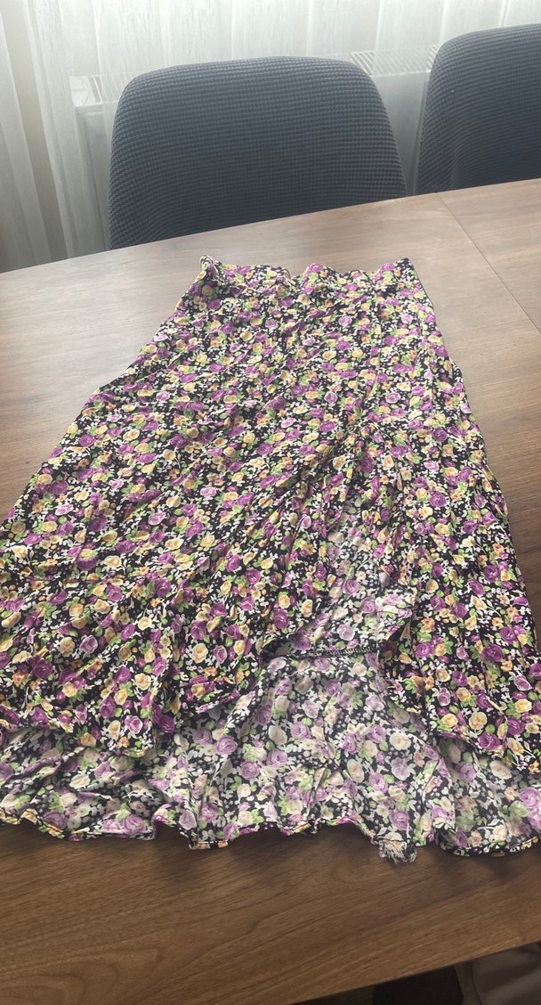 Bohem tarzda, bol kesim ve fırfırlı, koyu çok renkli batik desenli sentetik kumaştan uzun hamile eteği.