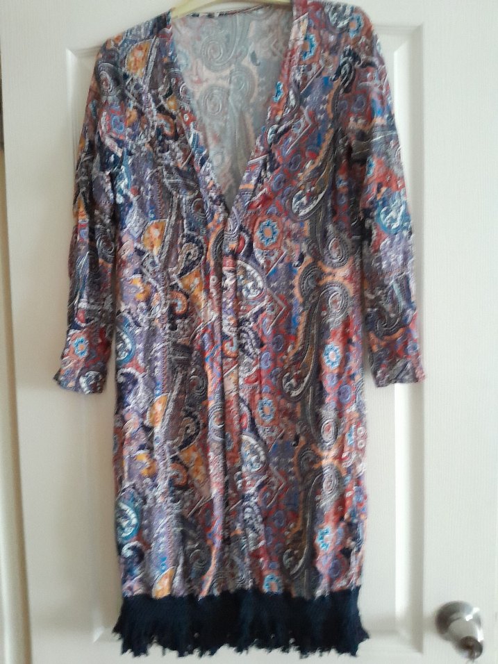 Bohem tarzda, standart, uzun kollu, V yakalı hamile tunik. Çok renkli koyu tie-dye deseni ve drapeli, günlük kullanıma uygun. iki kol arası 59 cm,waikiki ,elastan kumaş, pareo,sabahlık olabilir