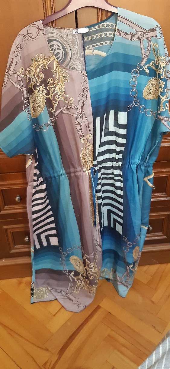 Bohem tarzda, kısa kollu, V yaka, bol kesim ve dökümlü uzun hamile tunik. Pastel çok renkli desenle günlük kullanıma uygun.