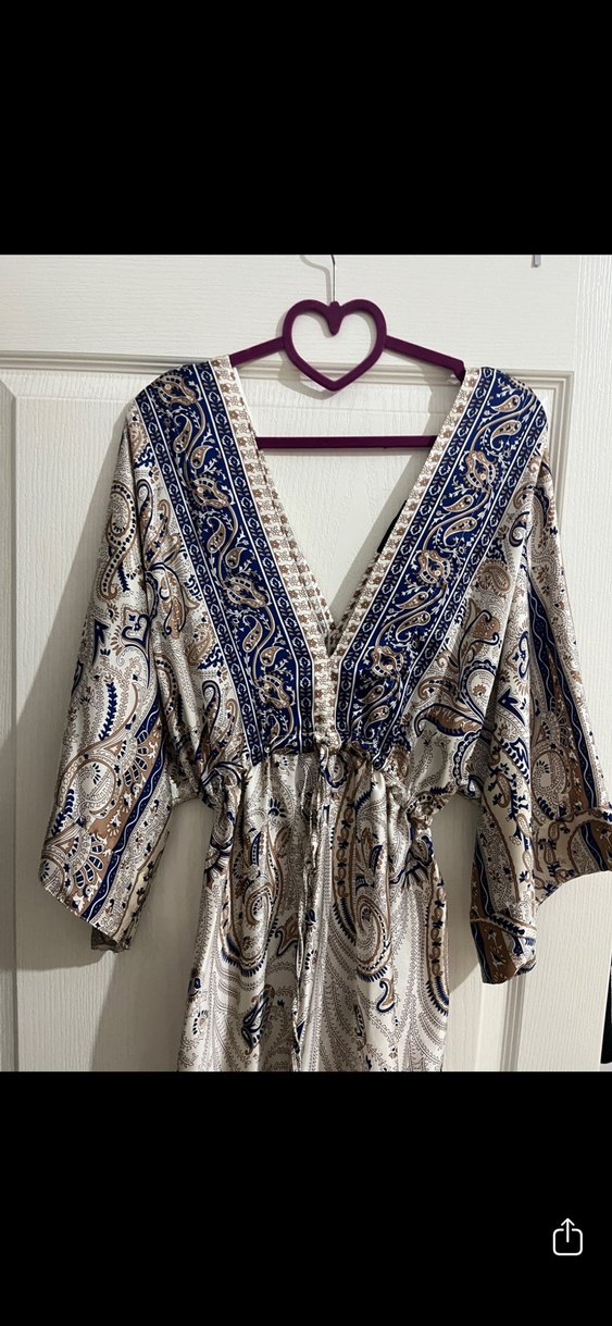 Bu uzun kadın elbisesi, bol kesim, derin V yaka ve mavi-bej tonlarında karmaşık paisley desenlere sahiptir. Geniş kollu ve bel kısmı büzgülü, rahat bir görünüme sahiptir.