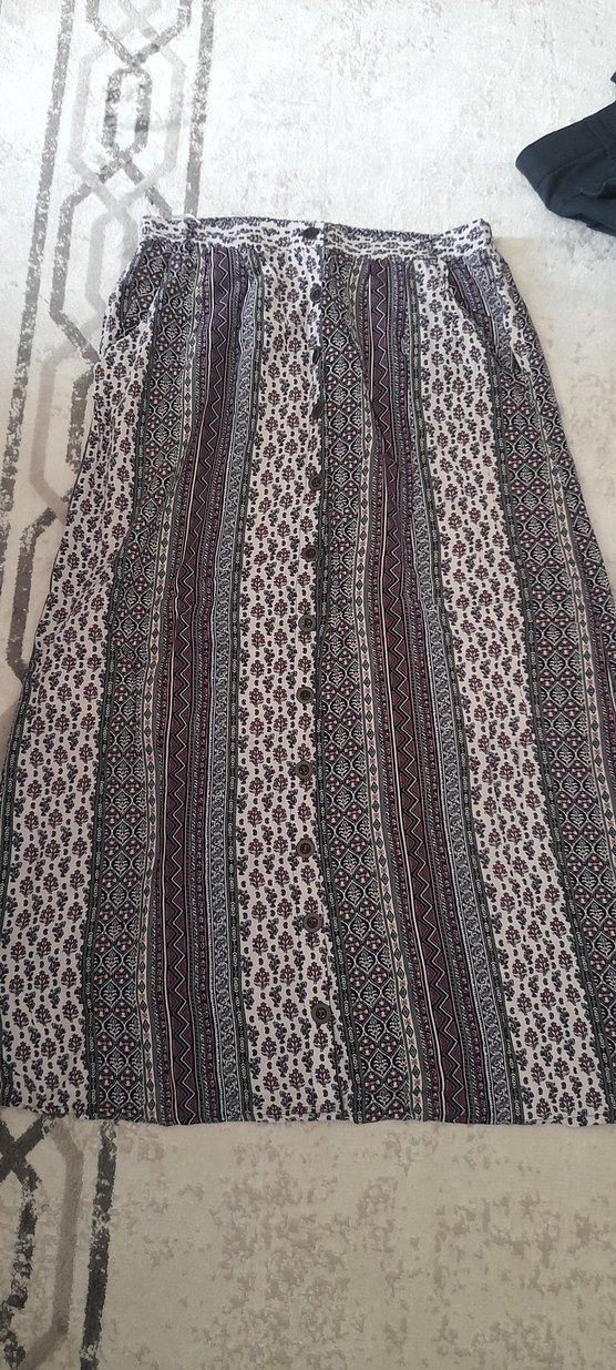 Bohem tarzda, çok renkli desenli, bol kesim ve drapeli uzun kadın eteği. Günlük kullanıma uygundur.
