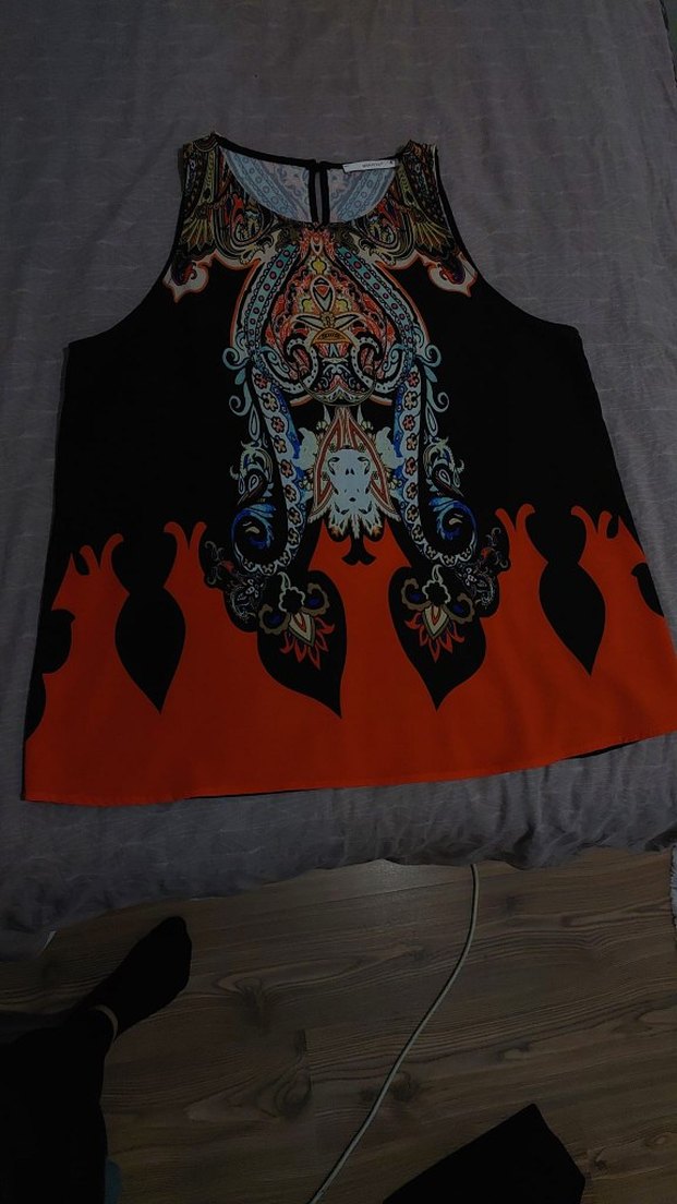 Kolsuz, yüksek yakalı, bol kesim ve dökümlü bohem tunik. Koyu sentetik kumaş üzerinde çok renkli desenli, parti için uygun.