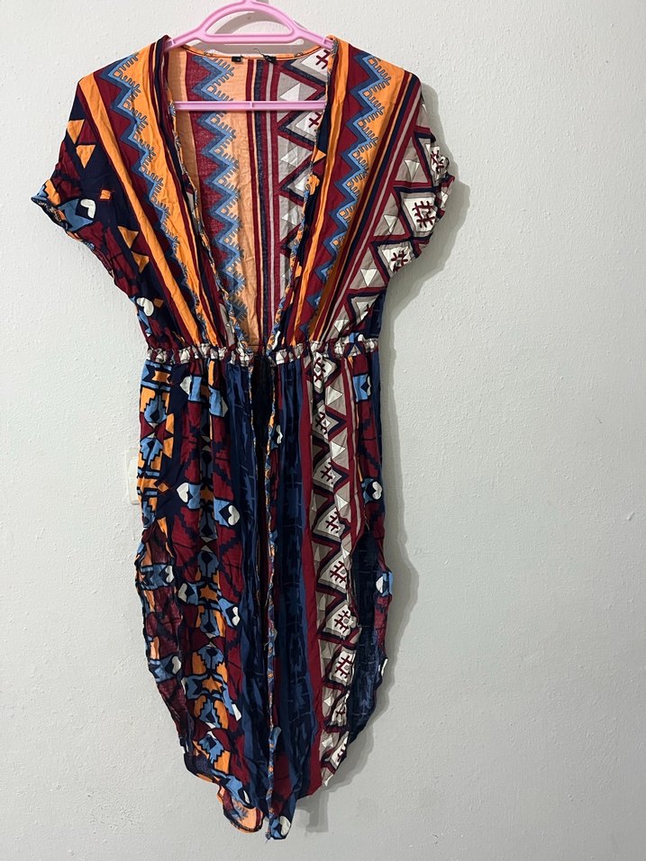 Bohem tarzı çok renkli uzun kimono, bol kesim ve drapeli tasarıma sahiptir. V yaka ve kısa kolludur. Yumuşak tekstil malzemeden üretilmiştir, günlük kullanıma uygundur.