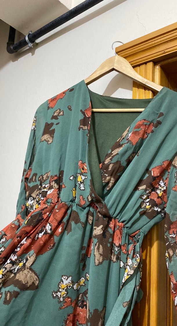 Bohem tarzda çok renkli, uzun kollu, V yakalı, dökümlü, bol kesim uzun hamile bluzu. Sentetik kumaştan üretilmiştir, günlük kullanım için uygundur.