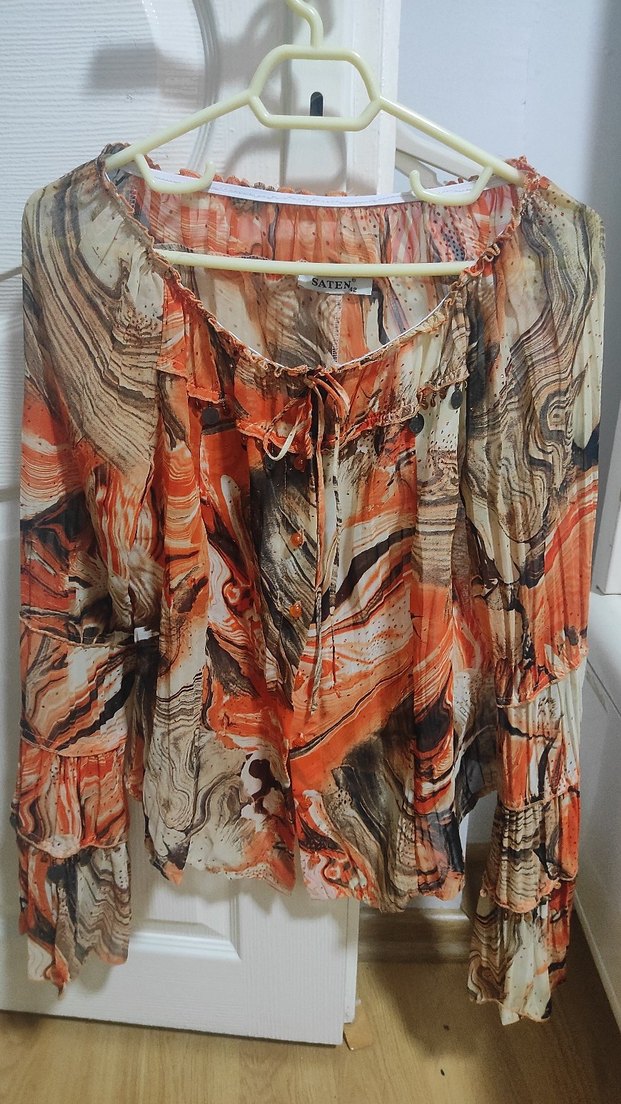 Bohem tarzı, bol kesim, drapeli ve kayık yaka uzun kollu bluz. Gri ve çok renkli batik desenli, sentetik kumaştan günlük kullanım için uygun.