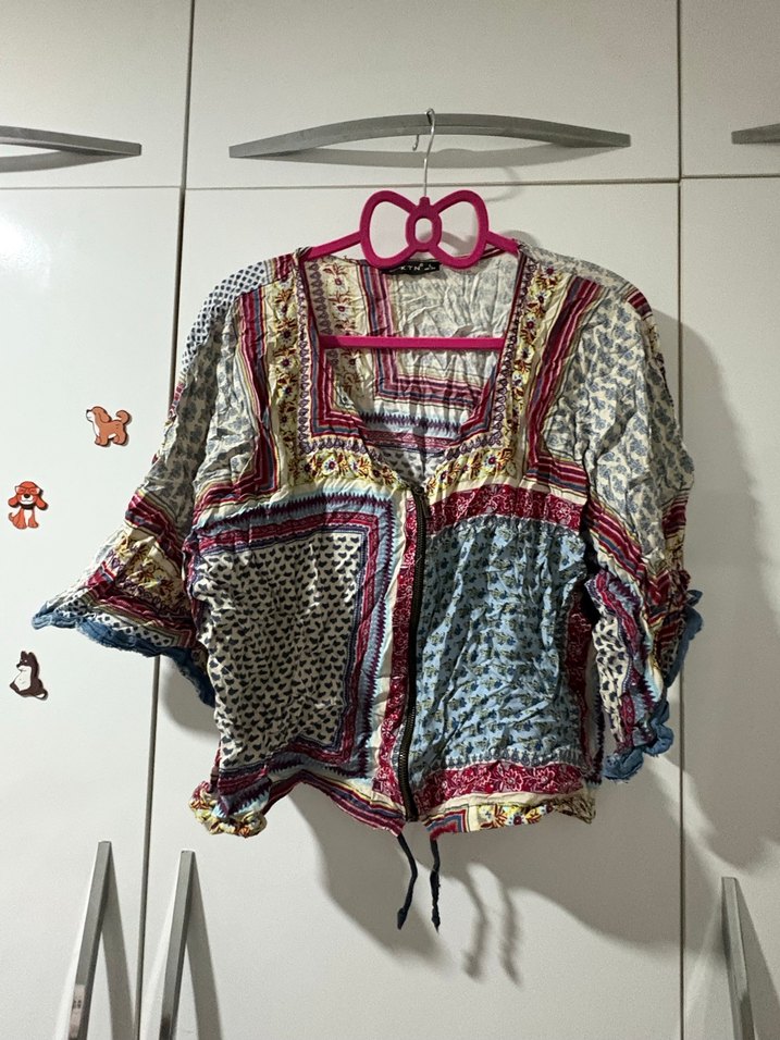 Bol kesim, çok renkli tie-dye desenli, düğmeli ve halter yakalı bohem bluz. Yumuşak dokulu kumaştan, günlük kullanım için uygun. Hiç bir sorunu yok ütüsüz olduğu için böyle gözüküyor çok iyi durumda.
