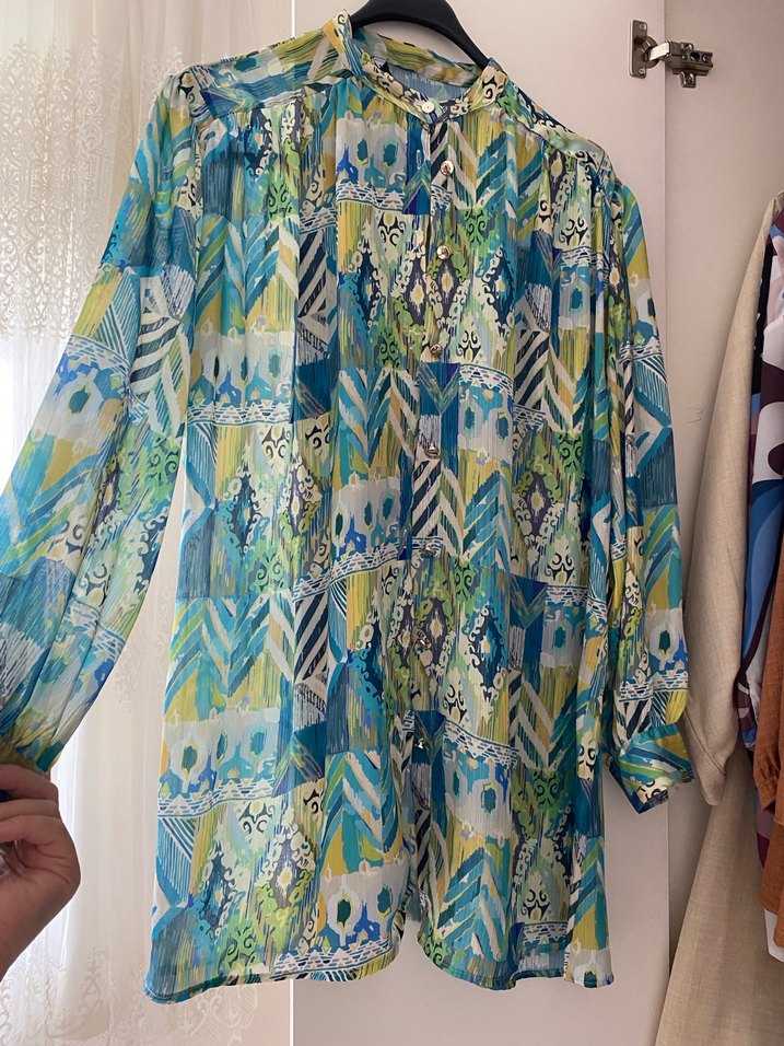 Bohem tarzı, bol kesim, düğmeli, uzun kollu, pastel çok renkli desenli gömlek. Yumuşak tekstil kumaştan, günlük kullanım için uygundur.