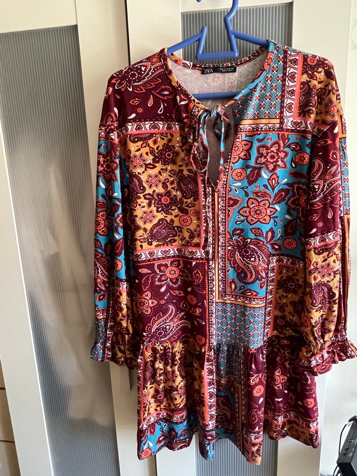 Bohem tarzda, bol kesim ve uzun kollu bu tunik, yüksek yakalıdır. Canlı çok renkli batik desenli ve püsküllü, günlük kullanım için uygundur. S/36 beden . 1 defa kullanıldı