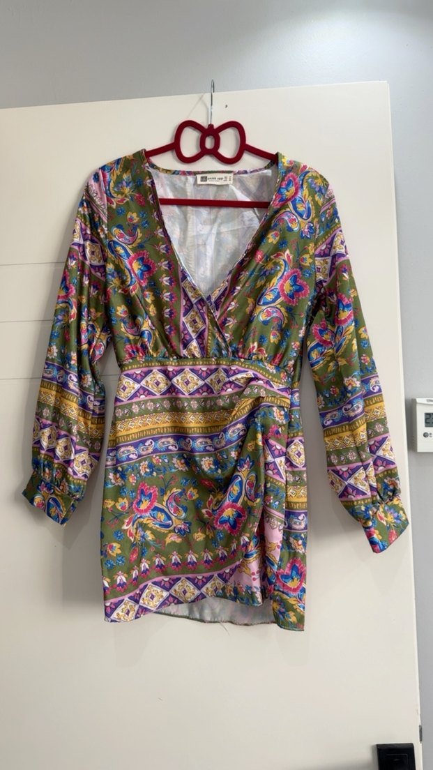 Çok renkli elbise , uzun kollu ve V yaka. Yumuşak sentetik kumaştan, salaş kesimli, günlük kullanıma uygun.
