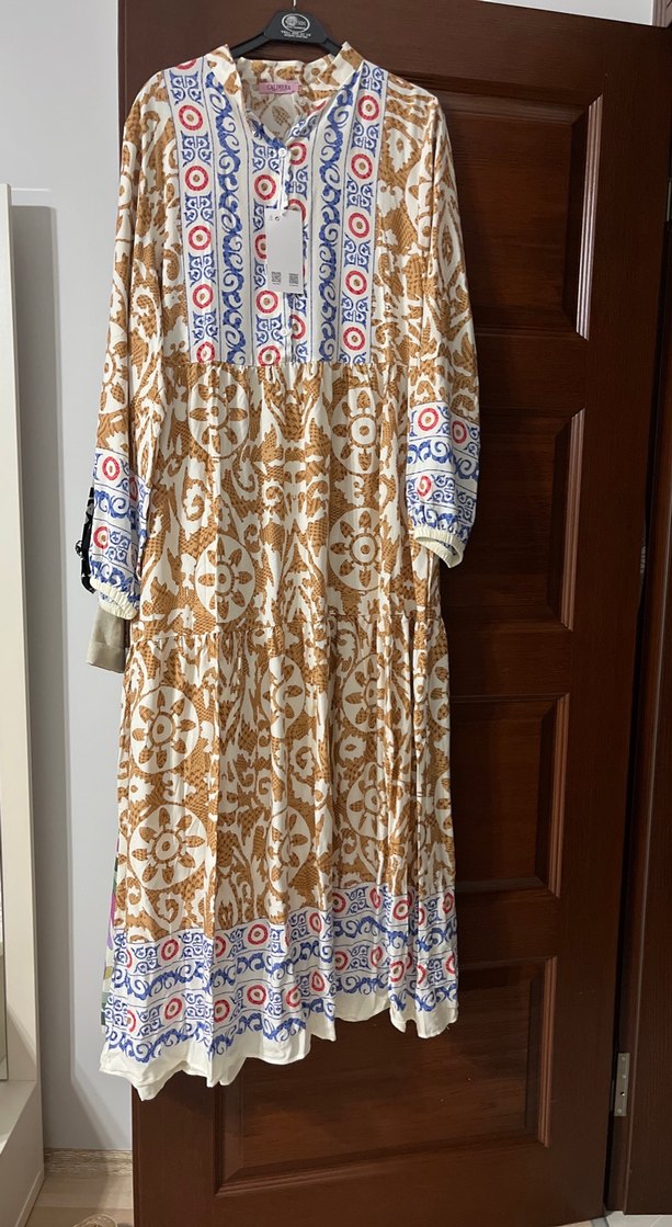 çok renkli, bohem tarzda, uzun kollu, pileli ve desenli uzun elbisesi. Salaş kesimi ve yuvarlak yakasıyla günlük kullanıma uygundur. İki kol arası 52 cm M-L uyumlu