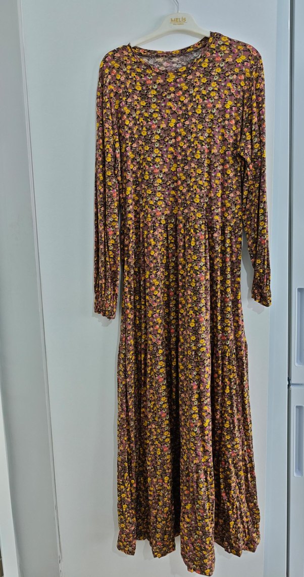 Yüksek yakalı, pileli ve uzun kollu, gevşek kesim bohem elbise. Koyu çok renkli batik desenli, yumuşak sentetik kumaştan yapılmıştır.