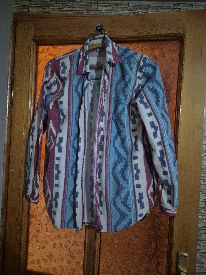 Bohem tarzda, düğmeli, uzun kollu, yakalı ve bol kesim gömlek. Koyu çok renkli batik desenli, tekstil kumaştan, günlük kullanıma uygun.